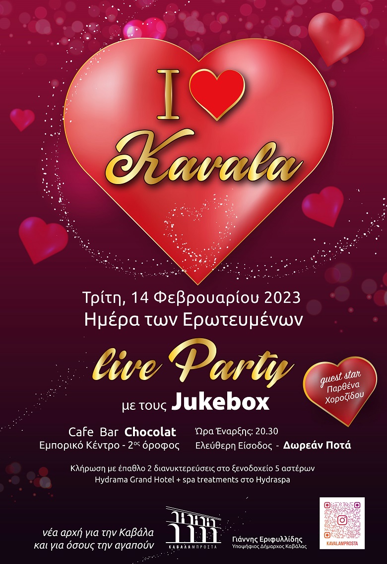 Στο πλαίσιο των δηλώσεών του, ο Γιάννης Εριφυλλίδης αναφέρθηκε και στην σημερινή εκδήλωση που θα γίνει στο πλαίσιο της ημέρας των ερωτευμένων τονίζοντας ότι ”Προσκαλούμε τους συμπολίτες μας σε ένα ξέφρενο πάρτι με θέμα ”I love Kavala”, με ζωντανή μουσική, κέφι, χορό και δώρα, σε έναν όμορφο χώρο, γεμάτο αγάπη και έμπνευση. Με guest star την Παρθένα Χοροζίδου, με δωρεάν ποτά και ελεύθερη είσοδο. Επίσης θα γίνει κλήρωση με έπαθλο δυο διανυκτερεύσεις στο ξενοδοχείο 5 αστέρων ”Hydrama Grand Hotel + spa treatments” στο Hydraspa. Με αφορμή την ημέρα των ερωτευμένων, κάνουμε μια διαφορετική εκδήλωση στο Cafe Bar Chocolat στο Εμπορικό Κέντρο στον 2ο όροφο στις 20:30, όπου και περιμένουμε όλες και όλους να μας τιμήσουν με την παρουσία τους, τόσοι οι νέοι όσο και οι μεγαλύτεροι. Θα ειναι μια βραδιά χωρίς πολιτική χροιά. Θέλουμε να περάσει ο κόσμος καλά και να δείξει και την αγάπη του για την πόλη μας. Είναι εκδηλώσεις που θέλει ο κόσμος, θέλει να ξεσκάσει μετά από δυο χρόνια μέσα στο σπίτι λόγω της πανδημίας. Πιστεύω ότι θα περάσουμε όλοι καλά”.
