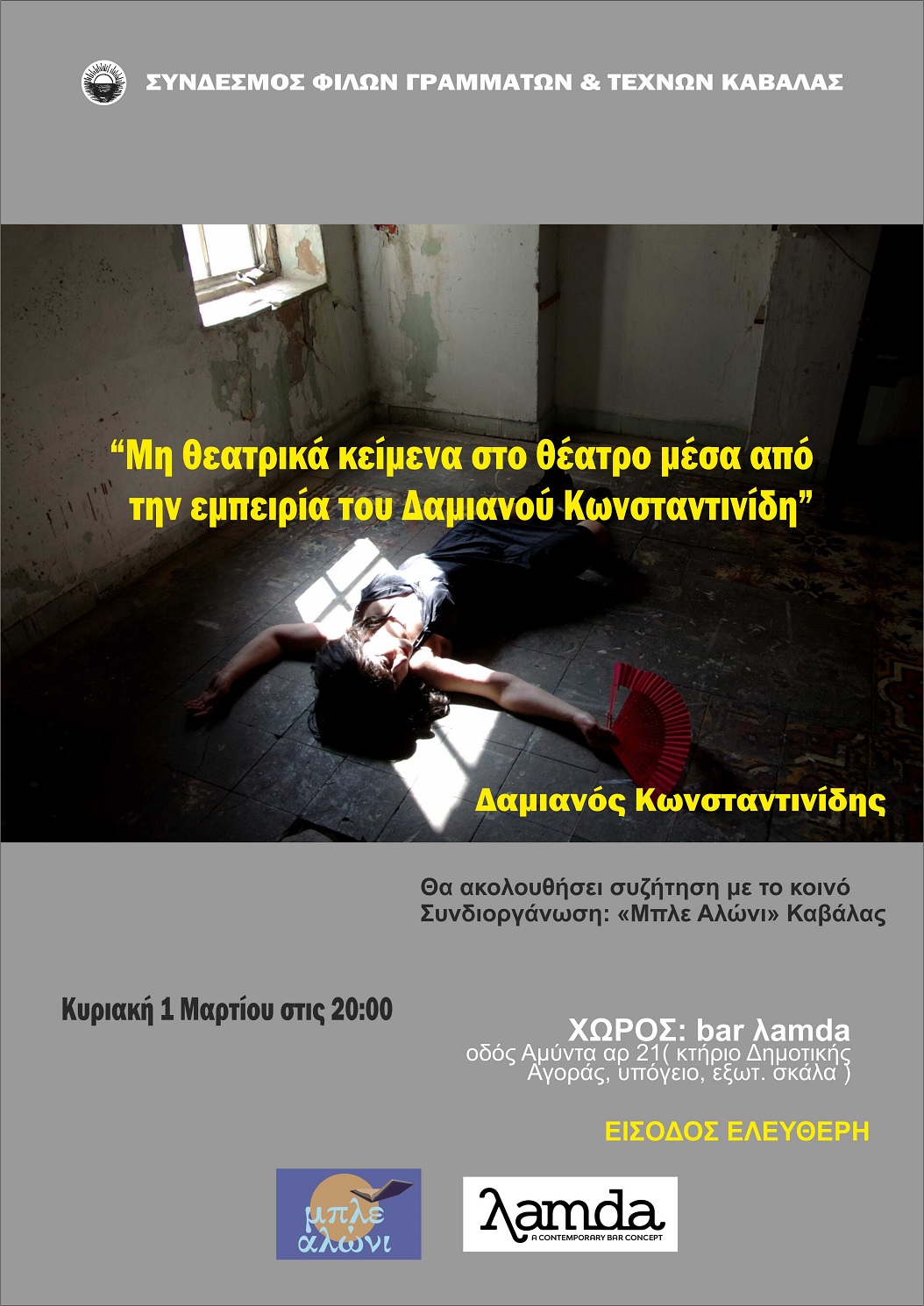 Ο Σύνδεσμος Φίλων Γραμμάτων και Τεχνών(Σ.Φ.Γ.Τ.) Καβάλας και η Λέσχη Ανάγνωσης  Μπλε Αλώνι Καβάλας σας προσκαλούν  την Κυριακή 1 Μαρτίου, στις 20:00, στον Πολυχώρο «λamda», στην εκδήλωση με τίτλο «Μη θεατρικά κείμενα στο θέατρο μέσα από την εμπειρία του Δαμιανού Κωνσταντινίδη».