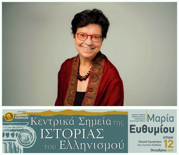 Ο Δήμος Καβάλας ανακοινώνει ότι έχουν εξαντληθεί όλα τα δωρεάν εισιτήρια για την ομιλία της Ιστορικού και Ομότιμης Καθηγήτριας του Εθνικού Καποδιστριακού Πανεπιστημίου Αθηνών, Μαρίας Ευθυμίου, η οποία θα διαρκέσει έξι ώρες (15:00 – 21:00 / Διάλειμμα 18:00 – 18:30) και θα πραγματοποιηθεί την Κυριακή 12 Οκτωβρίου 2025, στο κλειστό γυμναστήριο του 6ου Λυκείου Καβάλας.