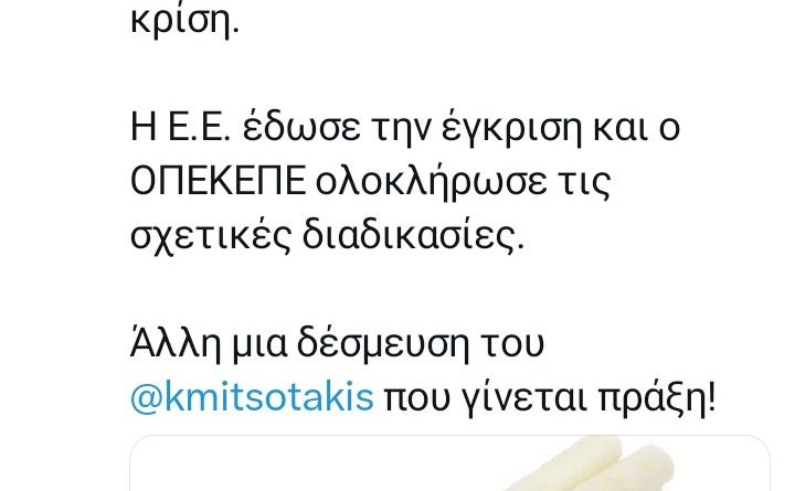 Η Ε.Ε., όπως σημειώνει, «έδωσε την έγκριση και ο ΟΠΕΚΕΠΕ ολοκλήρωσε τις σχετικές διαδικασίες.