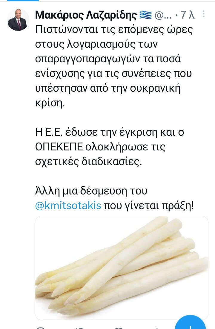 Με ανάρτησή του στον προσωπικό του λογαριασμό στο Twitter, ο υποψήφιος Βουλευτής Π.Ε. Καβάλας της Νέας Δημοκρατίας, κ. Μακάριος Λαζαρίδης κάνει γνωστό ότι «πιστώνονται τις επόμενες ώρες στους λογαριασμούς των σπαραγγοπαραγωγών τα ποσά ενίσχυσης για τις συνέπειες που υπέστησαν από την ουκρανική κρίση».