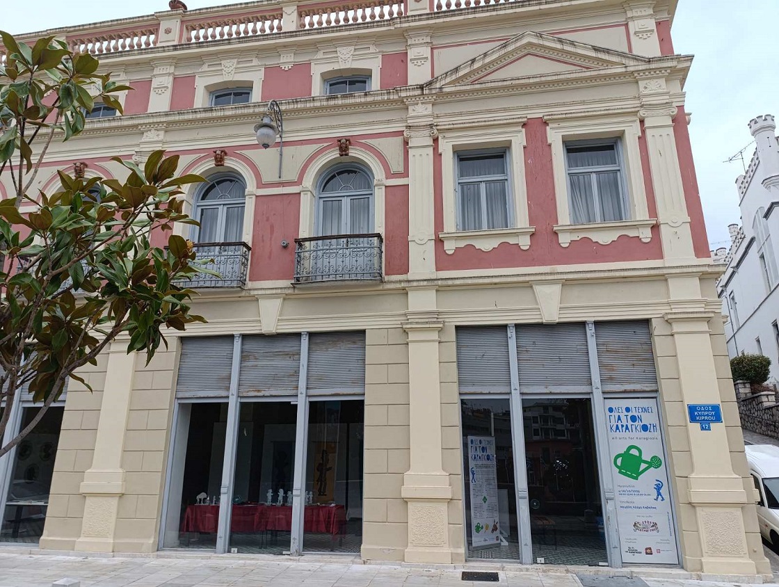 Οι πανέμορφες μεγάλες τζαμαρίες στο κτίριο της Μεγάλης Λέσχης στην Καβάλα φανερώνουν τα πάντα από το εσωτερικό στο ισόγειο. Το στήσιμο της έκθεσης «Όλες οι τέχνες για τον Καραγκιόζη» γίνεται υπό το βλέμμα μικρών και μεγάλων κατοίκων της πόλης, που μαγνητίζεται από τα εκθέματα που βλέπουν, καθώς περπατούν στο κέντρο της πόλης.