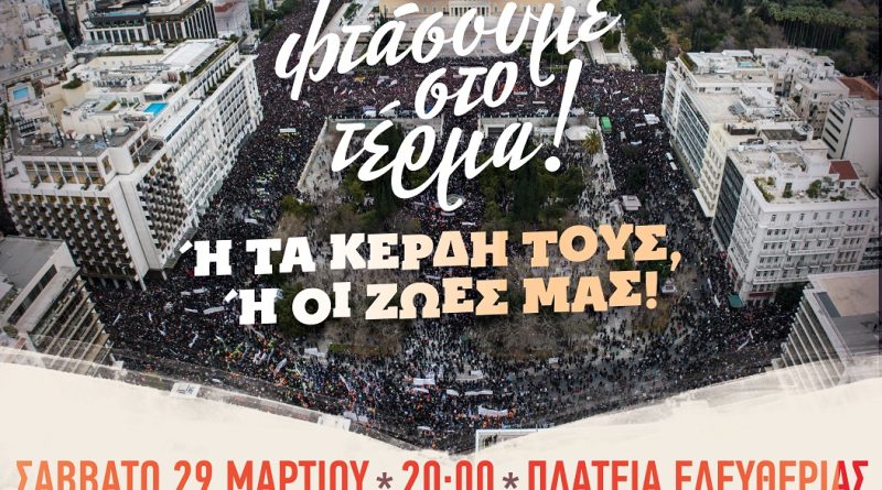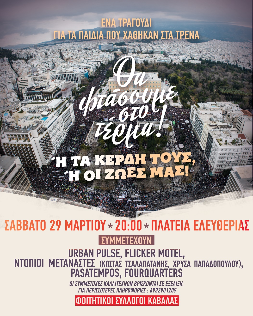 «Οι Φοιτητικοί Σύλλογοι Καβάλας διοργανώνουμε μεγάλη συναυλία με τίτλο: “Ένα τραγούδι για τα παιδιά που χάθηκαν στα τρένα. Θα φτάσουμε στο τέρμα! Ή τα κέρδη τους ή οι ζωές μας!” το Σάββατο 29 Μαρτίου, με ώρα έναρξης 20:00 στην Πλατεία Ελευθερίας.