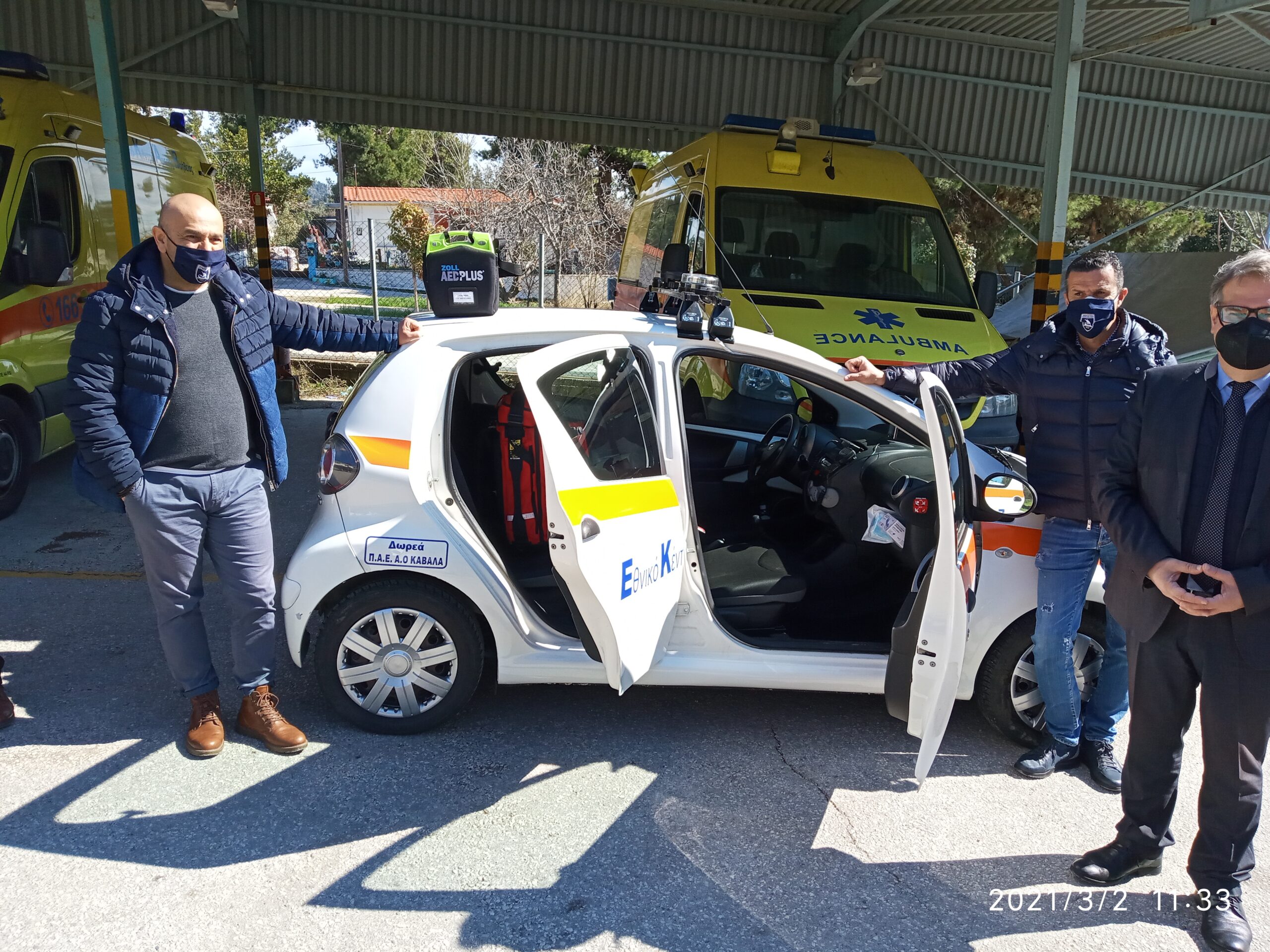 Συγκεκριμένα είπε ότι «αν και αργήσαμε αρκετά χρόνια, κάλλιο αργά παρά ποτέ. Στο δικό μας DNA, στο αίμα μας, κυλάει η επιθυμία για προσφορά προς τον συνάνθρωπο. Γι’ αυτό και όλες οι ενέργειες και τα θέλω μας έχουν σκοπό την προσφορά και τη βελτίωση των υπηρεσιών μας προς τους πολίτες. Σ’ αυτά τα πλαίσια εδώ και πολλά χρόνια είχαμε κάνει αυτό το αίτημα. Αρχικά δεν υπήρξε ενδιαφέρον. Ευτυχώς που είχαμε μία συζήτηση με τον γιατρό κ. Μιχάλη Σωτηρόπουλο, ο οποίος είχε γνώση σχετικά με αυτό το αυτοκίνητο. Μας έφερε σε επαφή με τη διοικούσα επιτροπή, τότε πριν 1,5 χρόνο περίπου, της ΠΑΕ ΑΟΚ κι ευδοκίμησε, για να έχουμε αυτήν τη στιγμή στο στόλο των οχημάτων μας αυτό το αυτοκίνητο. Είναι ένα όχημα μικρού όγκου, ταχείας επέμβασης, πλήρως εξοπλισμένο. Θα δουλεύει με έναν γιατρό και έναν διασώστη ως πλήρωμα και θα έχουν άμεση πρόσβαση σε περιοχές δυσπρόσιτες για τα άλλα αυτοκίνητά μας. Θα μπορούμε να πηγαίνουμε έτσι πιο γρήγορα εκεί, θα κρίνει ο γιατρός αν θα πρέπει να διακομιστεί το περιστατικό, θα του παράσχονται οι πρώτες βοήθειες και σε δεύτερο χρόνο θα γίνεται η διακομιδή του στο νοσοκομείο. Αυτή είναι ουσιαστικά μία ανάπτυξη υπηρεσιών του ΕΚΑΒ».